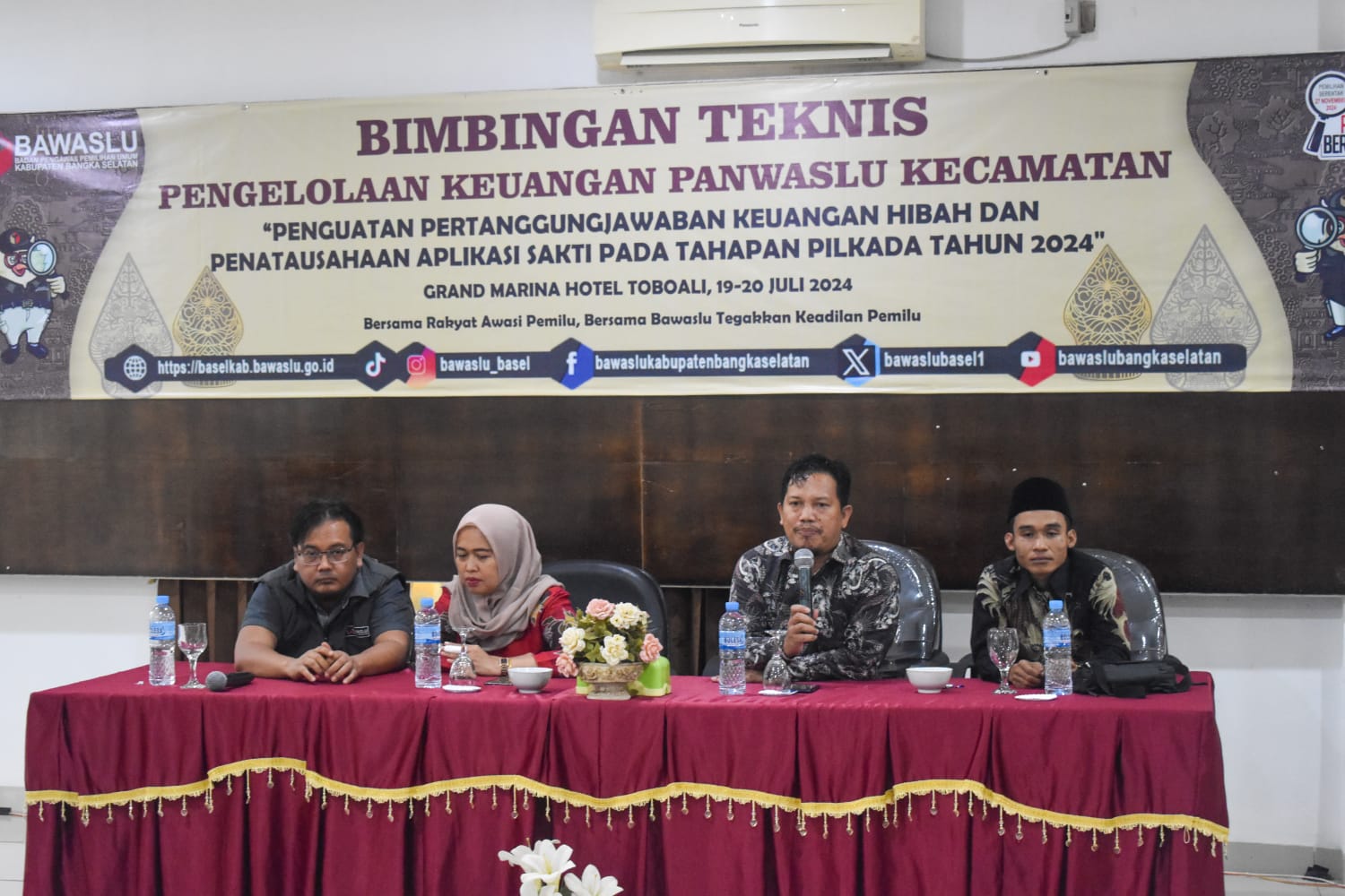 TOBOALI – Badan Pengawas Pemilu Kabupaten Bangka Selatan (Bawaslu Basel) menggelar kegiatan pengelolaan keuangan untuk Panitia Pengawas Pemilu Kecamatan (Panwaslu Kecamatan) dalam rangka mengoptimalkan anggaran tahun 2024. Acara yang berlangsung pada jumat-sabtu (19-20/07/2024) ini dihadiri oleh Ketua ,Kasek,SPK dan Staf keuangan Panwaslu Kecamatan se-Bangka Selatan.