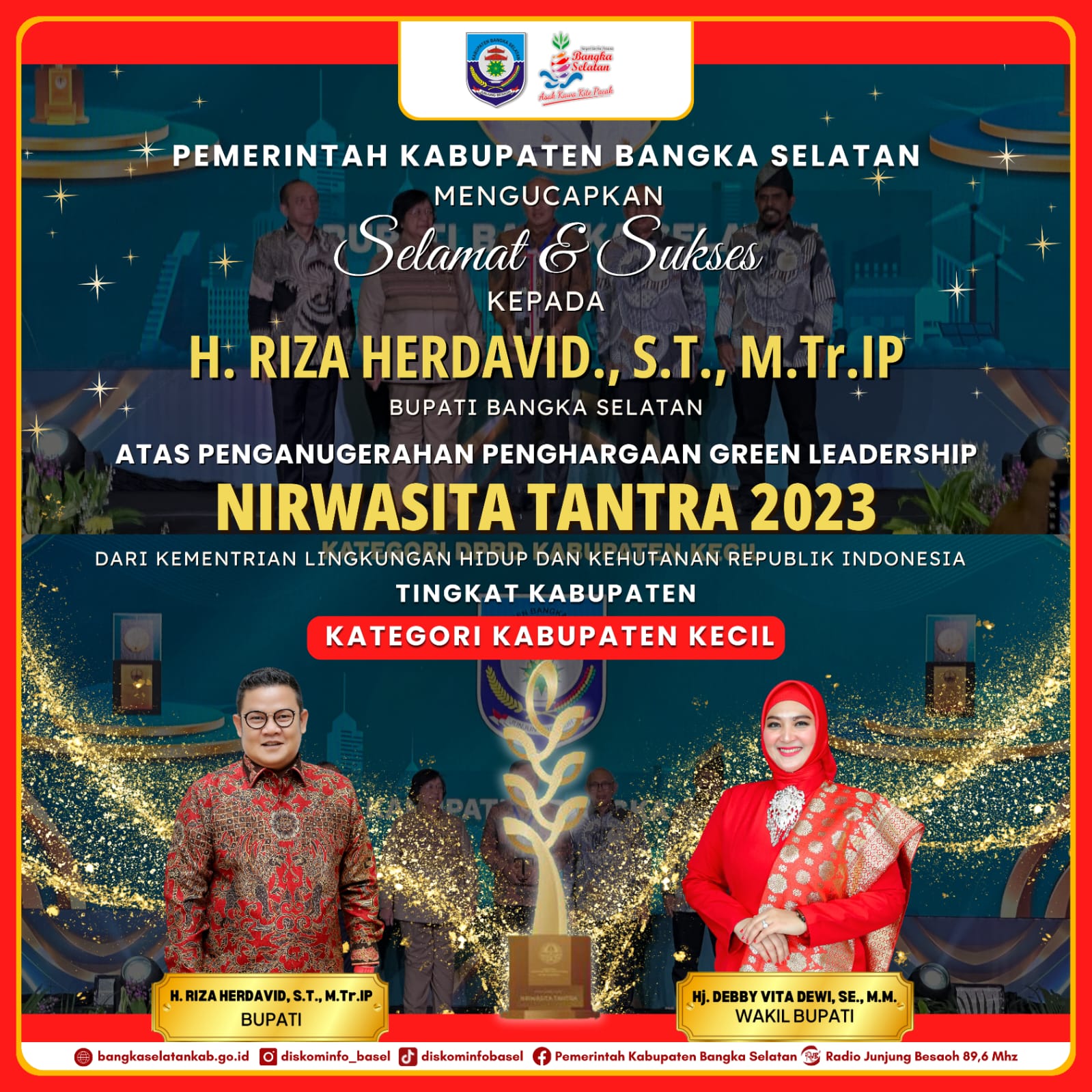 “Alhamdulillah, Kita tahun ini tidak hanya disematkan Piala Adipura, tetapi juga Nirwasita Tantra. Khusus di Babel, Basel menjadi daerah yang mendapatkan penghargaan ini,” tambah Riza.