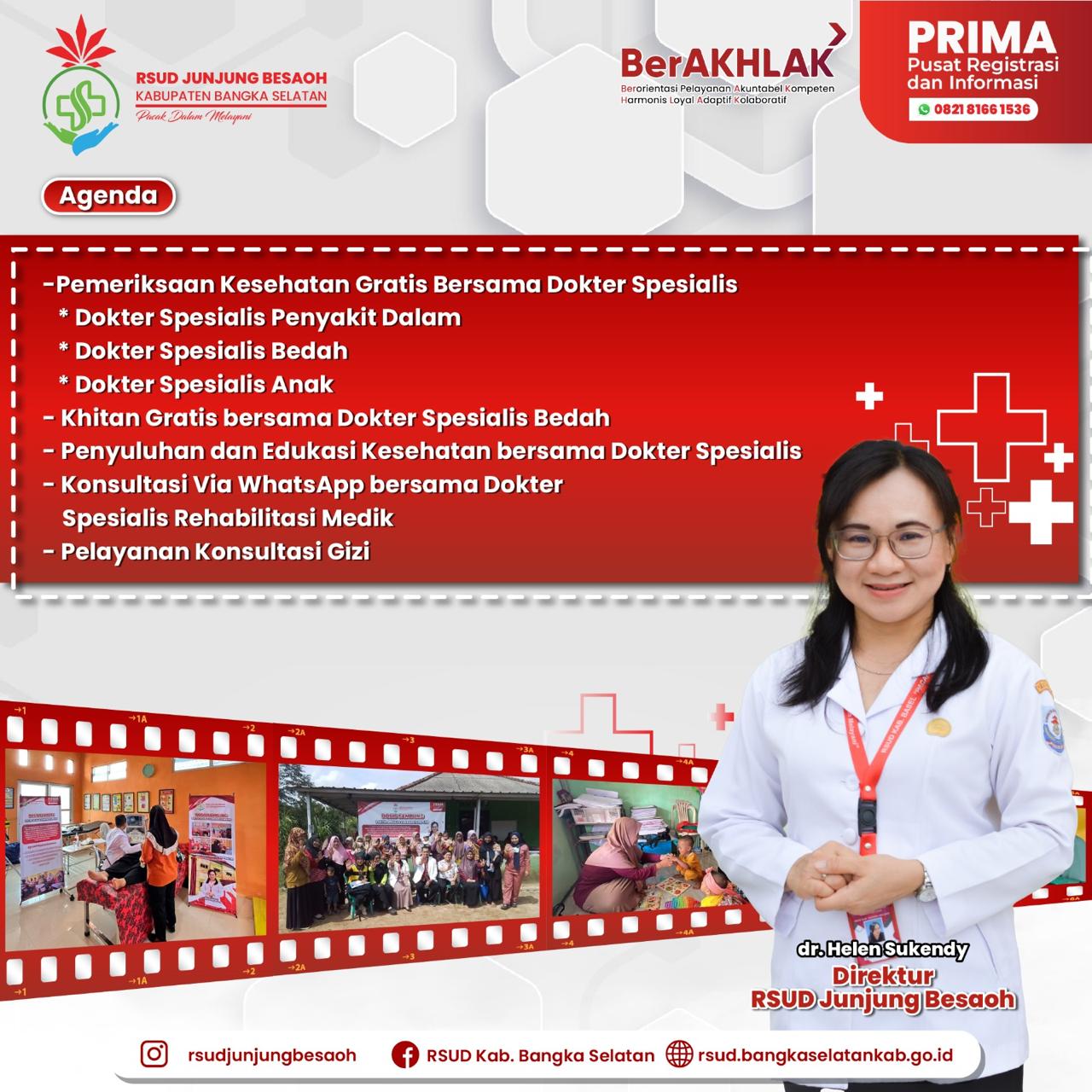 “Agenda pelayanan kesehatan meliputi pemeriksaan kesehatan dokter spesialis dan dokter umum, terpenting terselenggaranya edukasi dan pemberdayaan masyarakat secara langsung maupun online dengan penyuluhan dan edukasi kesehatan, konsultasi via WhatsApp serta fisioterapi,” jelas Helen.