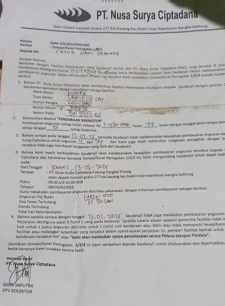 Dengan hal ini sangat disayangkan perusahaan sebesar PT. NSC yang berada di Kelurahan Bacang bikin ulah, dari SPV debt colektor bernama DODI SAPUTRA yang mengambil motor milik konsumen tanpa membawa surat lengkap saat penarikan, tidak menunjukan Sertifikasi Propesi Pembiayaan Indonesia (SPPI) dan Sertifikat Jaminan Fidusia.