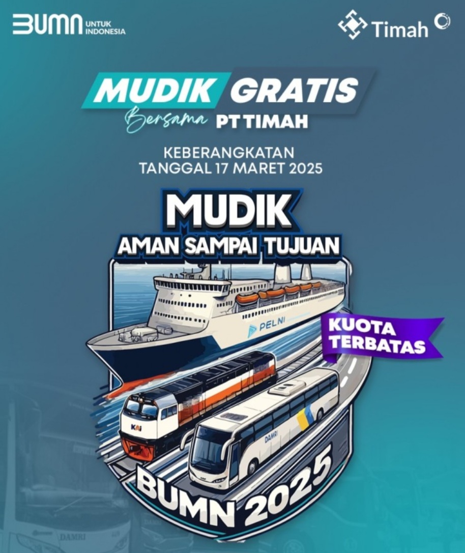 Mudik Gratis Bersama PT Timah ‘Mudik Aman Sampai Tujuan’ diperuntukkan bagi pelajar dan masyarakat umum. Mudik akan menggunakan transportasi bus dan kapal.