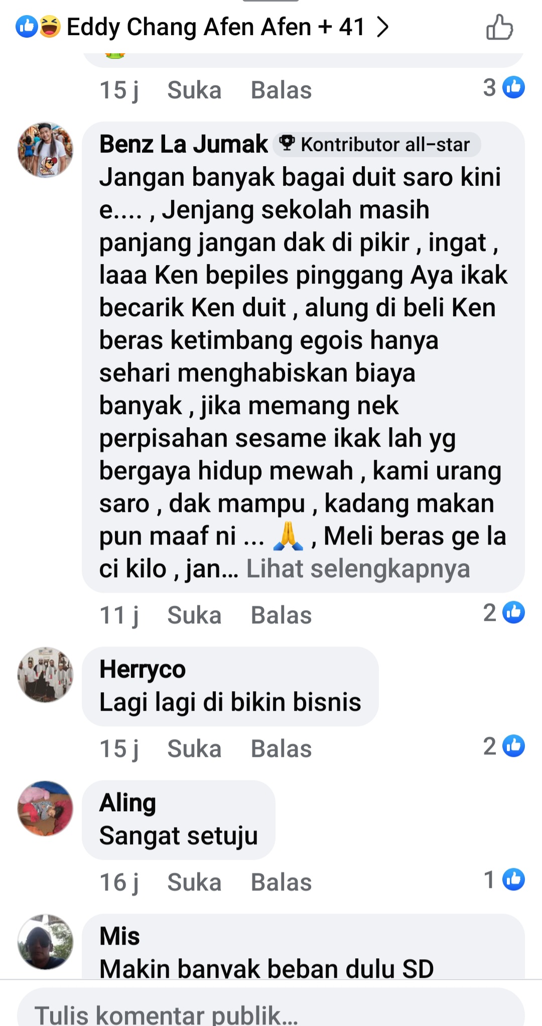 “Jangan banyak bagai duit saro kini e, jenjang sekolah masih panjang. Jangan dak dipikir, inget laa ken bepiles pinggang, Aya ikan becarik ken duit, alung dibeli ken beras,” tulis salah satu pengguna Facebook dalam unggahan yang viral pekan ini.