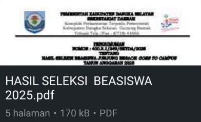 TOBOALI – Pemerintah Kabupaten Bangka Selatan resmi mengumumkan hasil seleksi Beasiswa Junjung Besaoh Goes to Campus Tahun Anggaran 2025. Pengumuman tersebut tertuang dalam surat Nomor: 400.3.1/249/SETDA/2025, Jumat (31/10/2025).