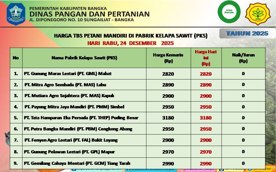 Sebagai informasi, berdasarkan data Dinas Pangan dan Pertanian yang beralamat di Jalan Diponegoro Nomor 10 Sungailiat, harga TBS dari sembilan Perusahaan Pabrik Kelapa Sawit (PKS) di Kabupaten Bangka. Rabu, 24 Desember 2025, tercatat tidak mengalami perubahan, yakni: