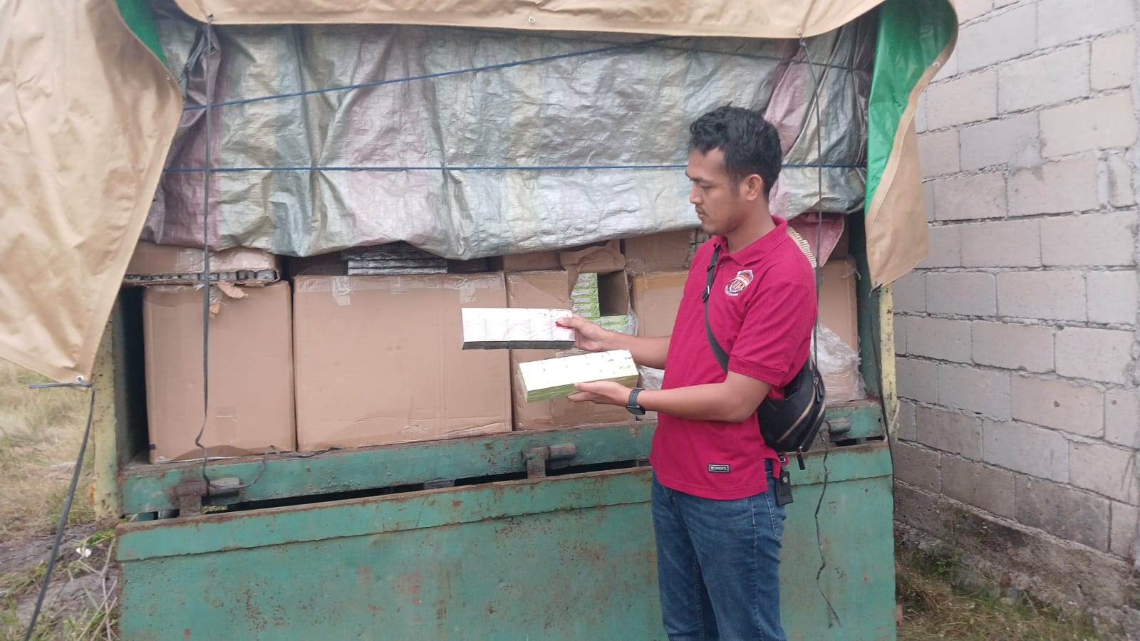 Setelah dilakukan pemeriksaan terhadap bak truk yang tertutup terpal, petugas menemukan tumpukan kardus dalam jumlah besar yang setelah dihitung berisi total 1.960.000 batang rokok diduga ilegal yang siap diedarkan di wilayah Babel.