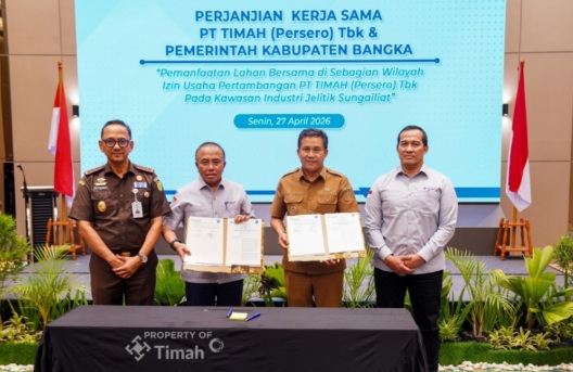 PANGKALPINANG — PT TIMAH (Persero) Tbk bersama Pemerintah Kabupaten Bangka menandatangani perjanjian kerja sama tentang Pemanfaatan Lahan Bersama di Sebagaian Wilayah Izin Usaha Pertambangan (IUP) PT TIMAH (Persero) Tbk pada Kawasan Industri Jelitik di Aston Emidary, Senin (27/4/2026).